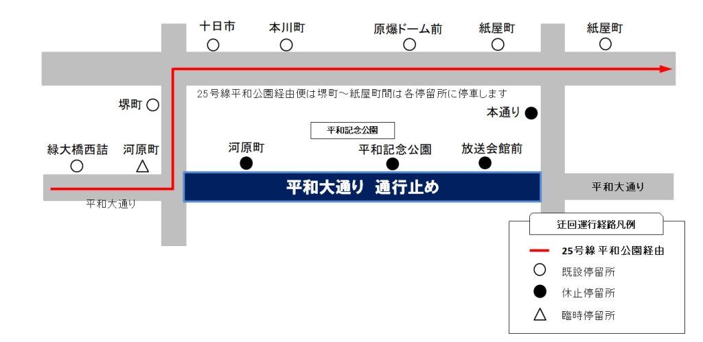 25号線(平和公園経由)広島駅方面ゆきについて迂回運行を実施します。