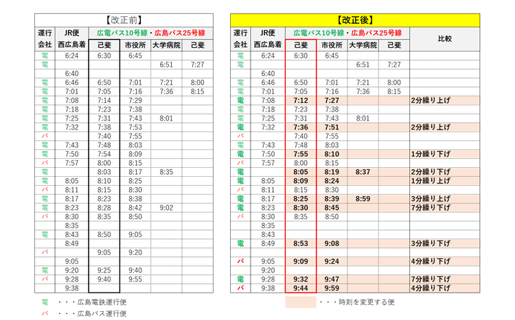 広島電鉄・広島バスでは、西広島駅発の市役所行きの発車時間の調整するダイヤ改正を行います。